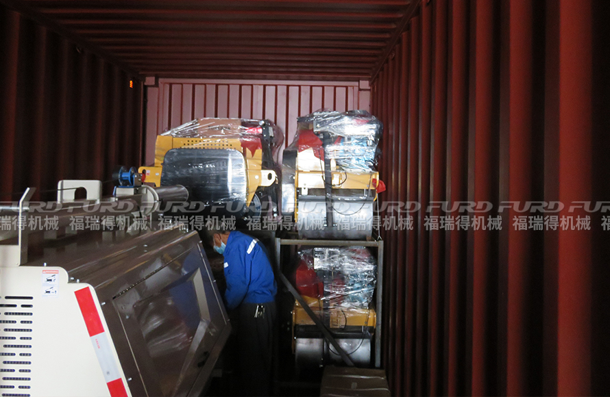 9月3日,福瑞得機(jī)械6臺手扶雙輪壓路機(jī)、和2臺9米移動燈車裝車出口非洲。